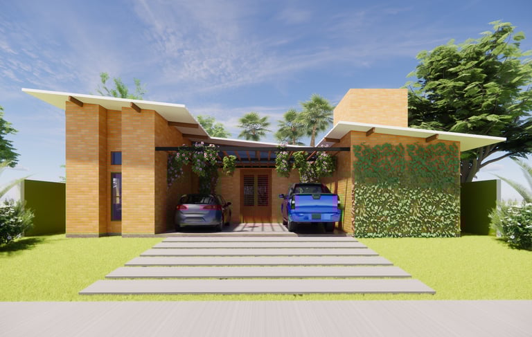 Esta casa térrea combina linhas modernas com um toque de rusticidade, resultando em uma residência acolhedora e funcional. Com três quartos, sala e cozinha integradas, garagem, área de serviço e uma belíssima área de lazer, o projeto foi pensado para um casal que valoriza a praticidade do dia a dia sem abrir mão do conforto e da presença do verde.